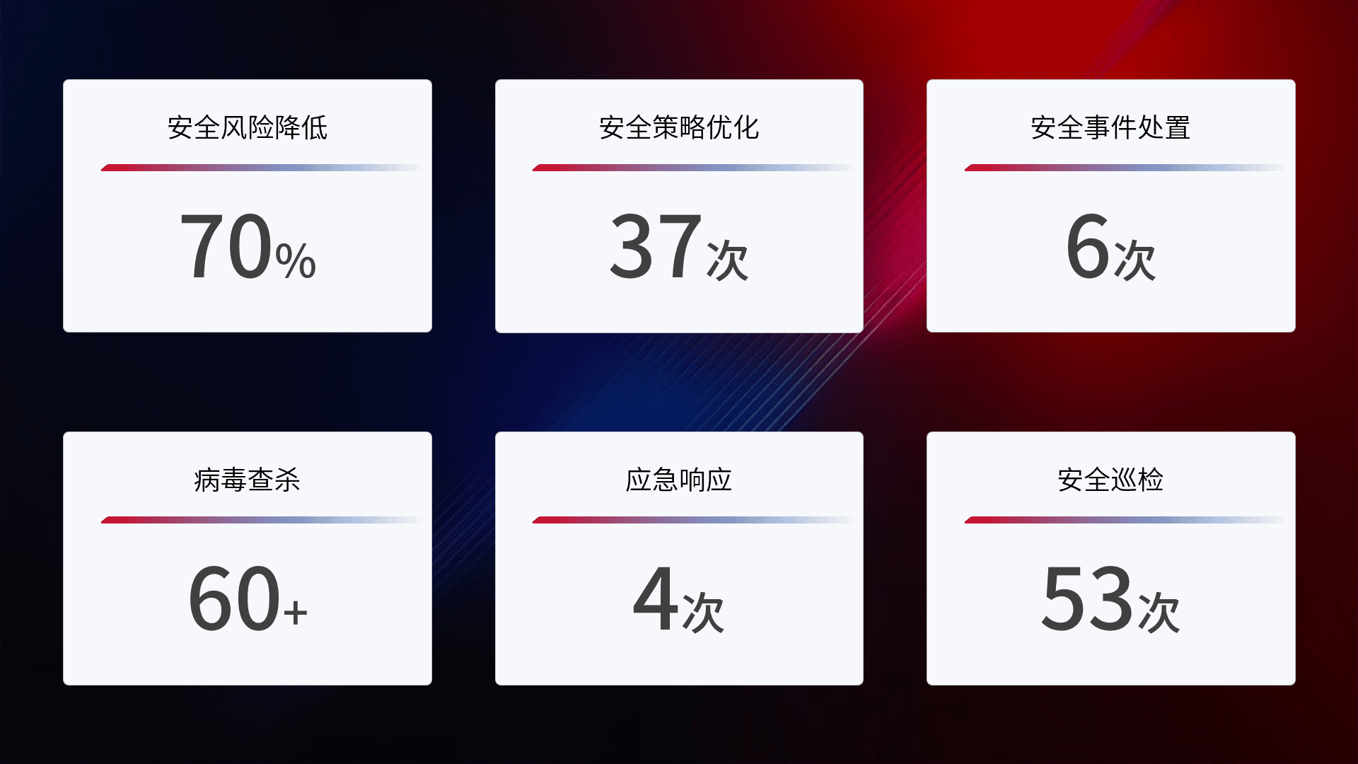 提供全面的安全事件报告体系,,包括处置报告、、、、周报、、季度和年度总结,,,结合持续监控,,,,帮助客户深入了解网络安全状况。。。