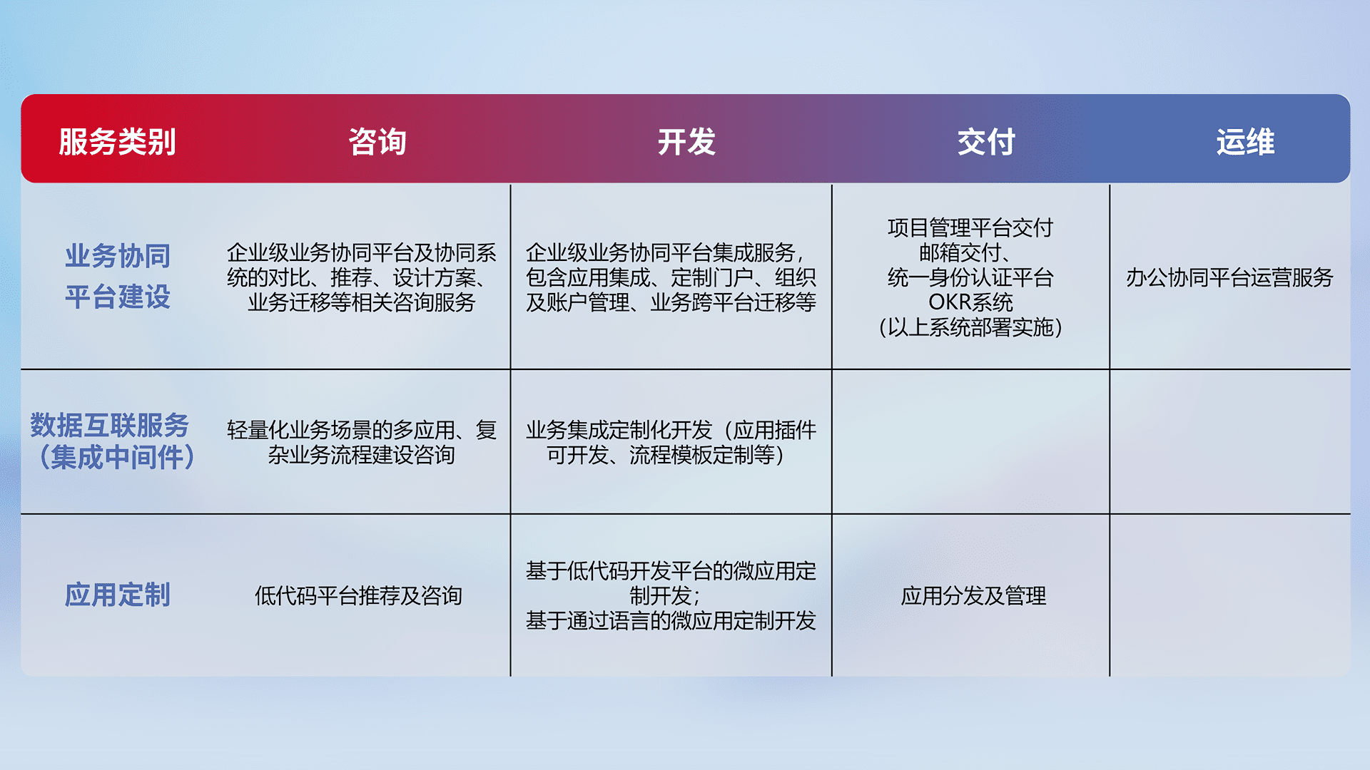 针对钉钉、、企微、、、、IDaas等平台级产品提供产品的规划、、、方案、、、交付、、、定制化开发等服务,,,实现如统一协同办公、、、、智能客户服务、、、、混合会议管理、、、、智能数据查询、、等业务场景,,,实现数字化转型。。。