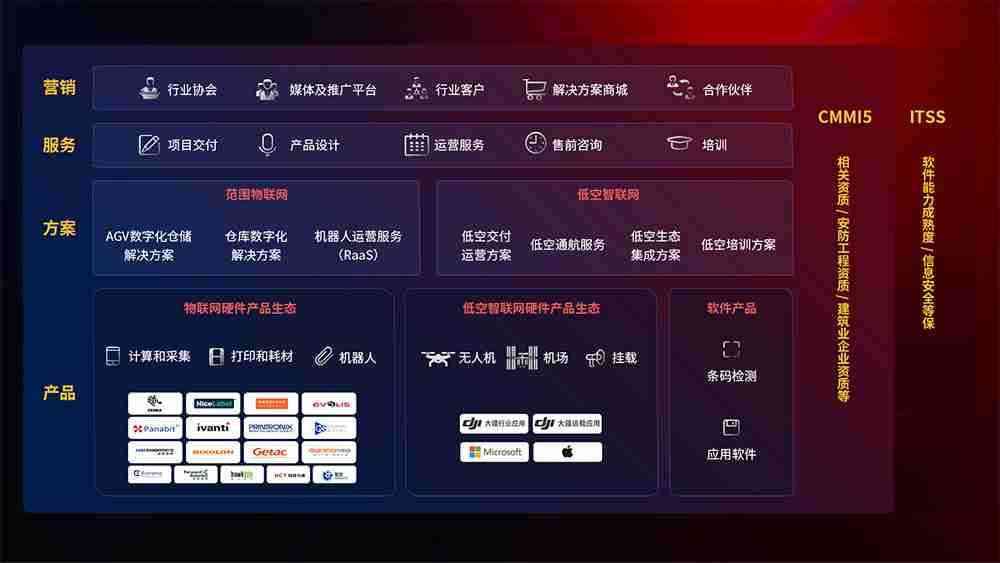 聚合国内外先进的物联网硬件产品品牌,,聚焦数字化仓储、、、、机器人运营、、低空智联网等领域,,,,共同打造适合客户业务场景的解决方案并提供交付服务